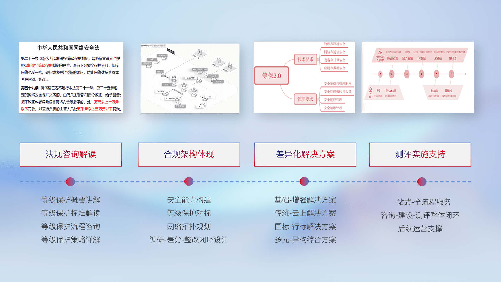 通过专业的法律咨询解读、、、、合规架构体现、、、、差异化解决方案、、、、测试实施支持等服务,,为客户量身打造等保合规体系。。
